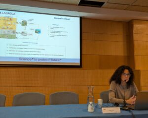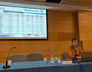 Fig 8. Ana Isabel Gomes mostrando datos sobre los análisis de los contaminantes, fármacos, aditivos de plásticos más abundantes en los muestreos de las depuradoras que participan en el proyecto Bluewwater.