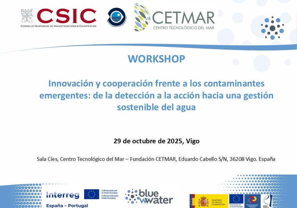 El pasado 29 de octubre, en el marco de las actividades de comunicación y transferencia del proyecto BlueWWater, se celebró en el salón de actos de CETMAR (Vigo) el workshop “Innovación y cooperación frente a los contaminantes emergentes: de la detección a la acción hacia una gestión sostenible del agua”.